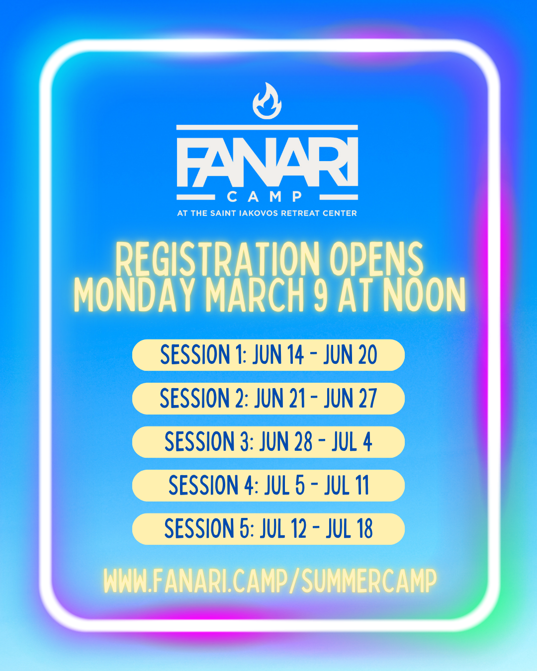 Fanari Summer Camp is our summer camping ministry, available for rising 6th grade through rising 12th grade campers. Our summer camp program has five individual sessions each year, running from mid-June through mid-July. Each year, 150-170 campers join us each week of Fanari Summer Camp for growth in their faith & friendships, while having a ton of fun along the way. Some of our most enjoyable activities include: Worship, Orthodox Life & Bible Study, Boating & Swimming, Summer Olympics, dances, field trips, and much more!